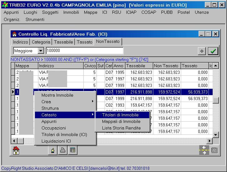 Esempio di lista degli immobili non tassati (in parte o interamente): Dopo aver liquidato tutti i soggetti per un certo anno d'imposta, ed eseguito la liquidazione degli immobili, si possono interrogare gli immobili che non risultano tassati al 100%. Questa lista č la base di partenza per individuare le possibili evasioni o per sistemare i dati non risultanti al comune.