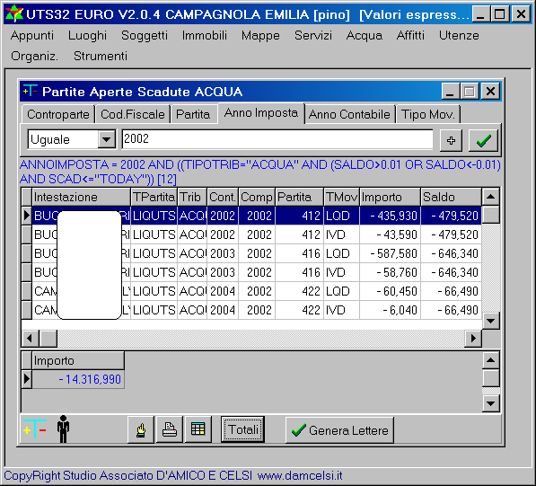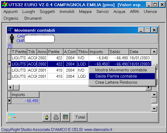 La creazione delle partite contabili consente di interrogare la situazione debitoria complessiva e del singolo contribuente, di sollecitare le partite aperte scadute, di interrogare i movimenti IVA a debito o a credito di un certo periodo, .. Esempio di situazione debitoria di un contribuente: