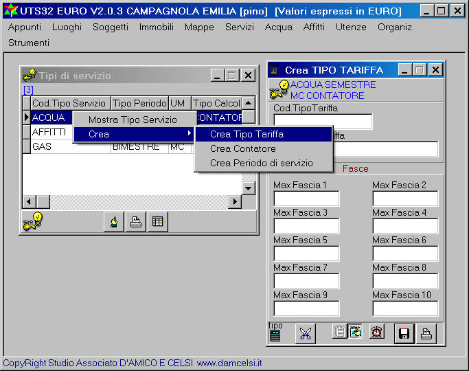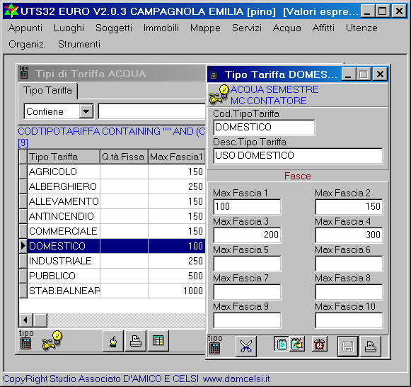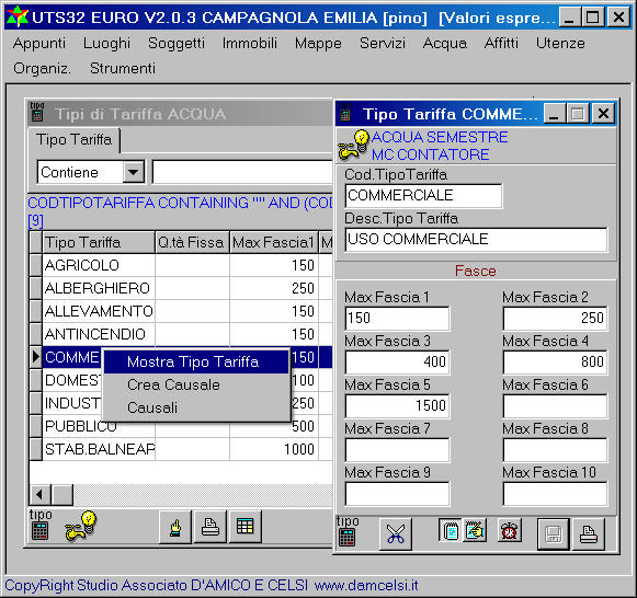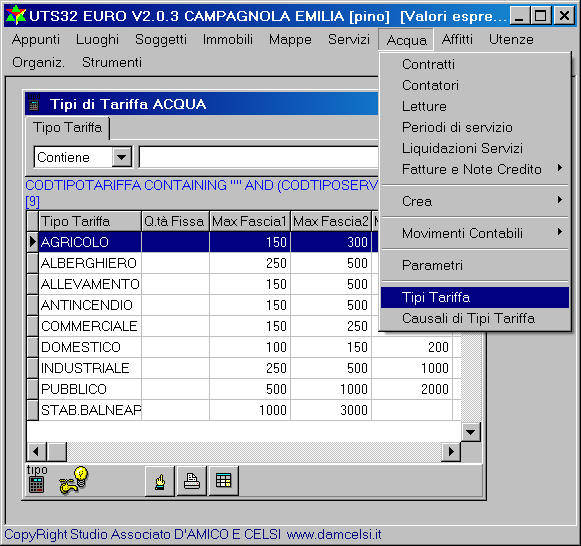 La Lista dei Tipi Tariffa già creati è consultabile dal Menù principale Acqua/TipiTariffa: